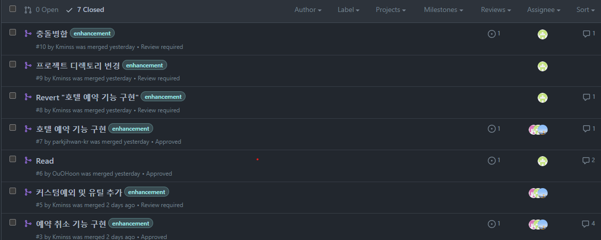 PR을 올려 코드리뷰를 하며 병합하는 과정을 경험하였다.