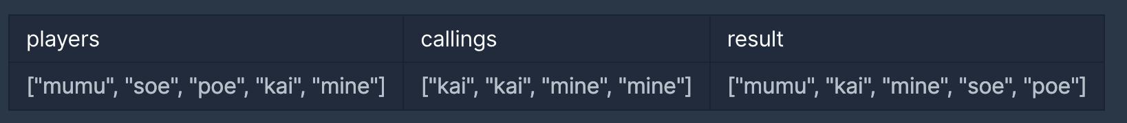 이름을 담은 문자열 배열 callings가 매개변수로 주어질 때, 경주가 끝났을 때 선수들의 이름을 1등부터 등수 순서대로