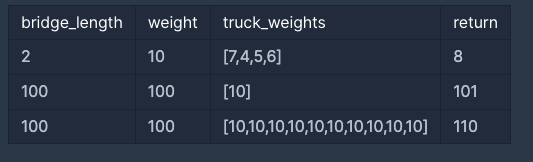 - bridge_length는 1 이상 10,000 이하입니다.