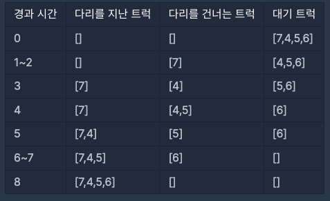 예를 들어, 트럭 2대가 올라갈 수 있고 무게를 10kg까지 견디는 다리가 있습니다. 무게가 [7, 4, 5, 6]kg인 트럭이 순서대로 최단 시간 안에 다리를 건너려면 다음과 같이 건너야 합니다.