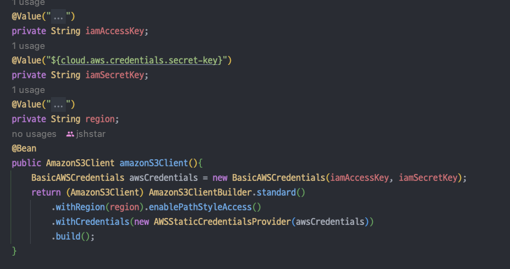 S3 연동을 위해서는 AWS Client를 생성하여 리소스에 Credential 정보를 설정해야한다.