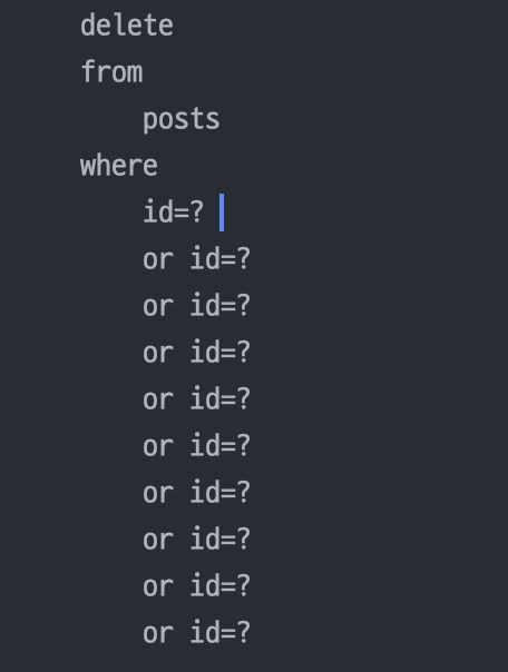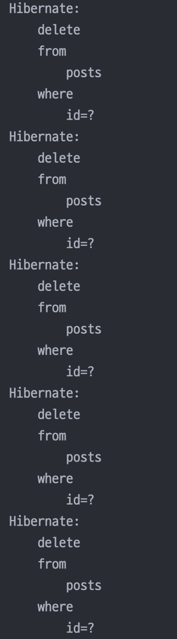 코드를 보면 Iteratable을 상속받는 클래스타입의 객체(필자는 List를 넘김) 에서 for문을 통해 delete 쿼리를 날리고있었다.