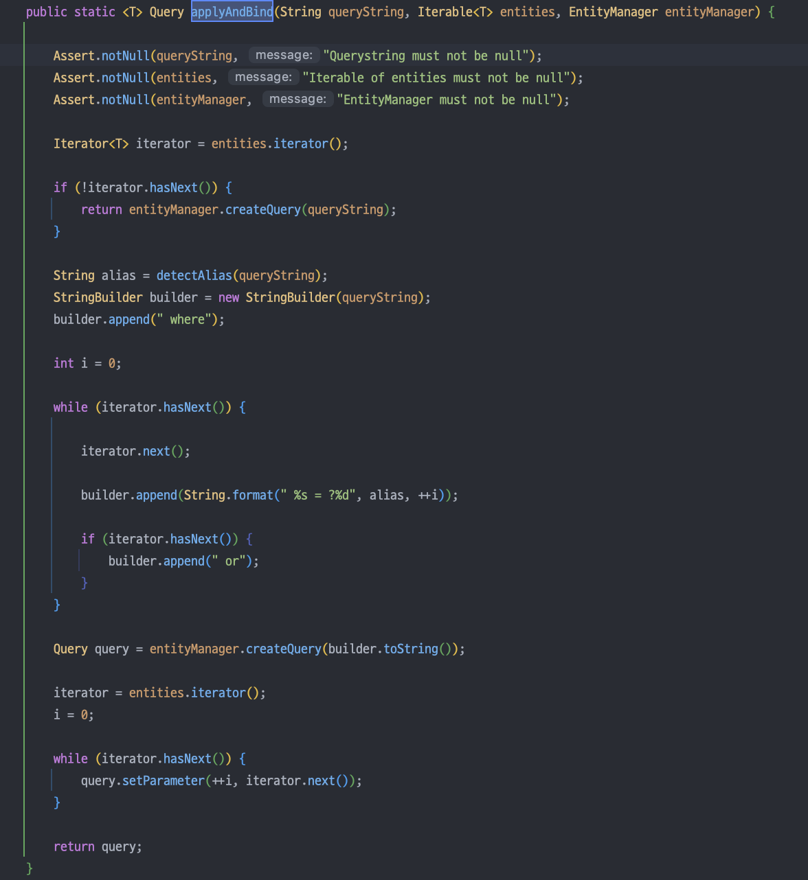 applyAndBind 코드를 보니 내부에서 or를 붙여 하나의 쿼리를 만드는 것을 알 수 있었다.