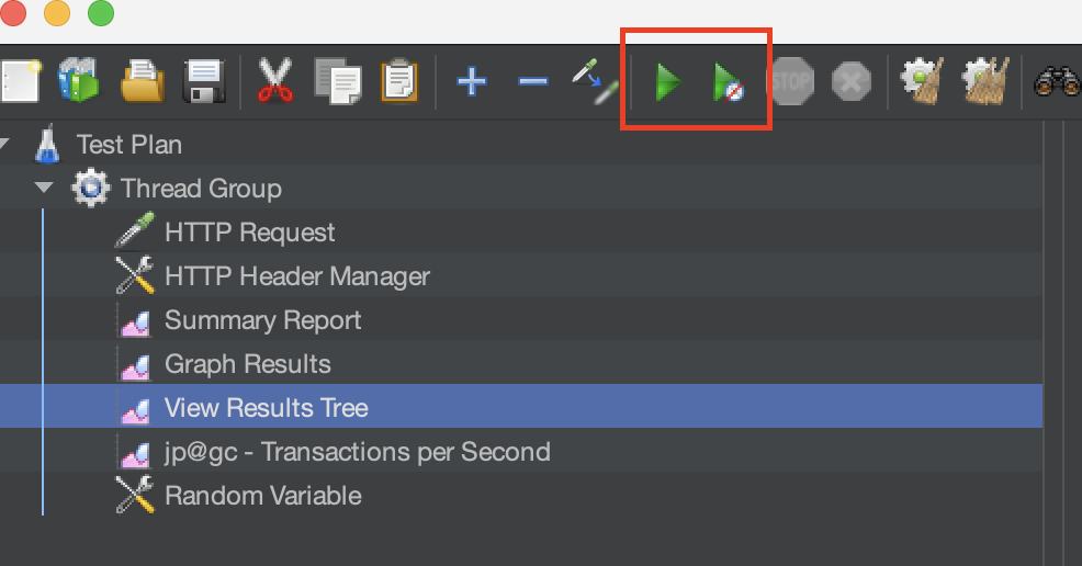 리스너가 등록된다음에 기존에 등록한 Sampler를 실행하면됩니다. 다음 이미지에 보이는 실행버튼을 누르게 되면 우측 상단 부분에 처음에 Thread Group에서 설정한 User(Thread Count 수)만큼 숫자가 설정되면 테스트를 진행합니다.
