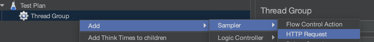 Http API를 테스트를 하기 때문에 Thread Group > Sampler > HTTP Request를 눌러 추가해줍니다.