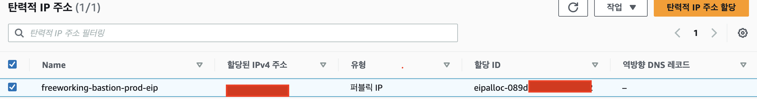 탄력적 IP 주소를 할당해줘 고정 IP로 변경해줍니다.