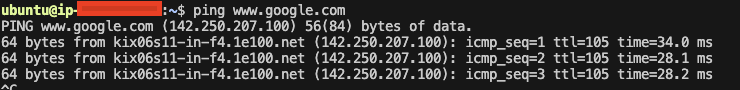필자는 API 서버가 될 Ec2를 연결하였으니 해당 인스턴스에 접속해서 ping www.google.com 으로 테스트를 하였습니다.