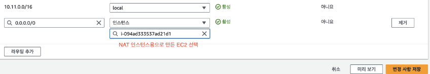 인터넷 트래픽이 NAT Instance를 통해 들어올 수 있도록 라우팅 테이블에 추가를 해야합니다.