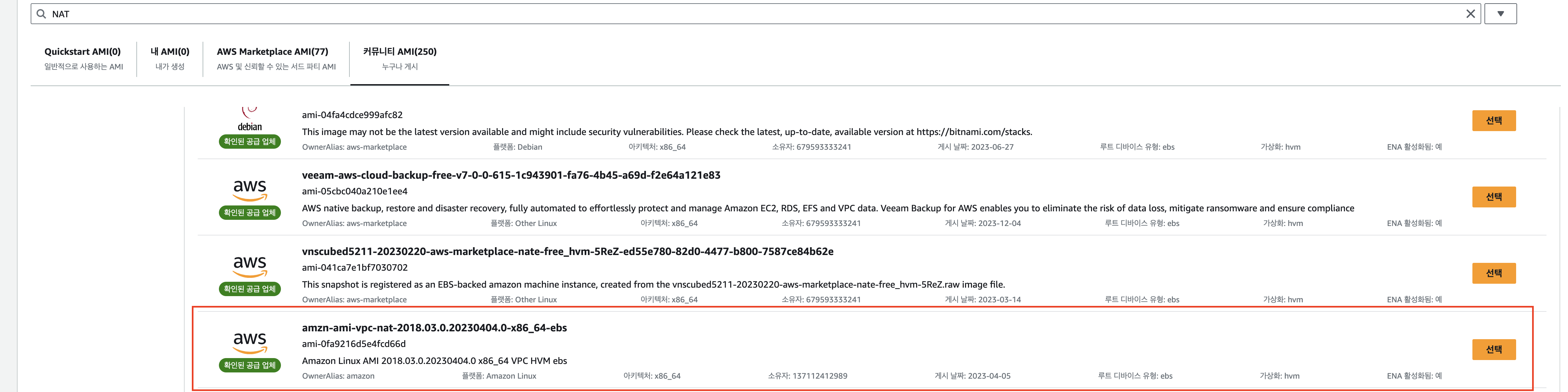 2. 커뮤니티 AMI -> `NAT` 검색해서 nat 용 ami 선택하기