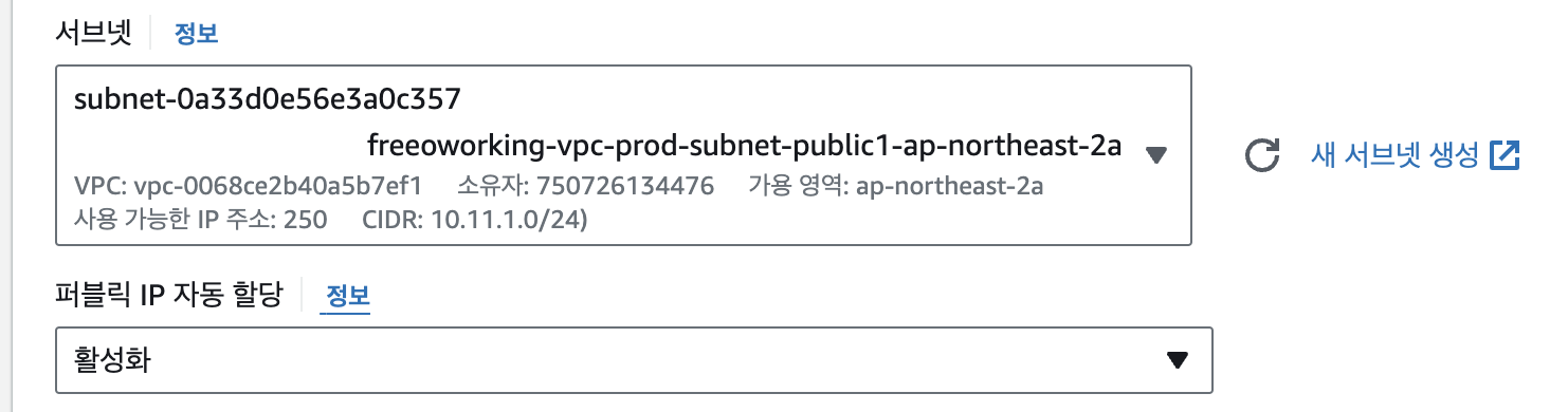 서브넷은 public subnet(인터넷 게이트웨이 연결된 서브넷)으로 설정하고 퍼블릭 IP 할당을 활성화해줍니다.