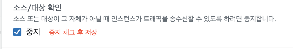 NAT 인스턴스의 소스/대상 확인변경에서 `중지` 로 변경합니다.